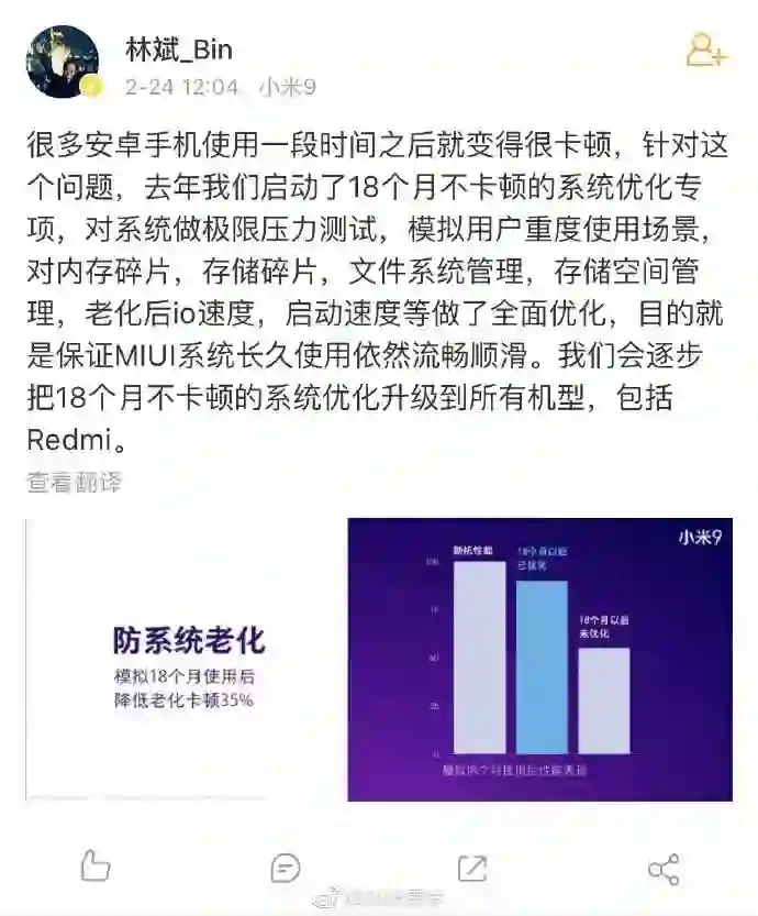更给力的是,这不是小米9专属福利,林斌强调,“会逐步把18个月不卡顿的系统优化升级到所有机型,包括Redmi。”