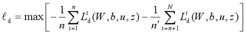 与深度网络自适应迁移方法类似,深度对抗网络的损失函数也由两部分构成:网络训练损失函数 和领域判别损失函数 ,如下所示。