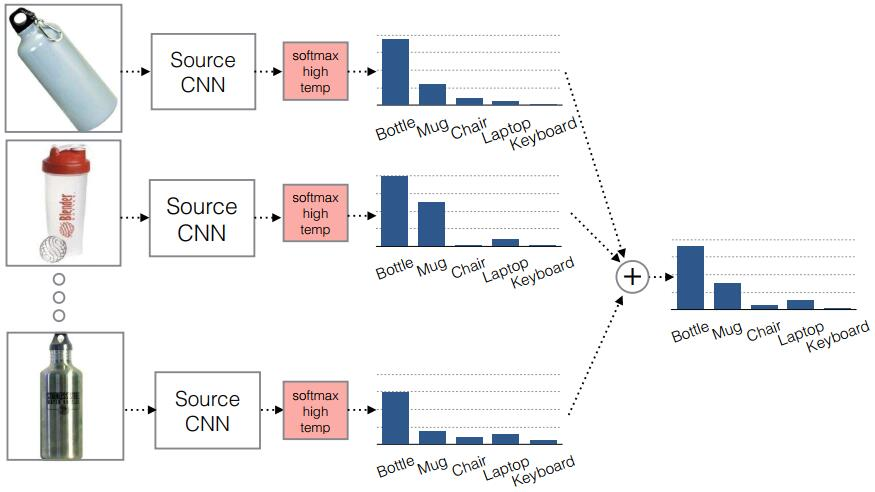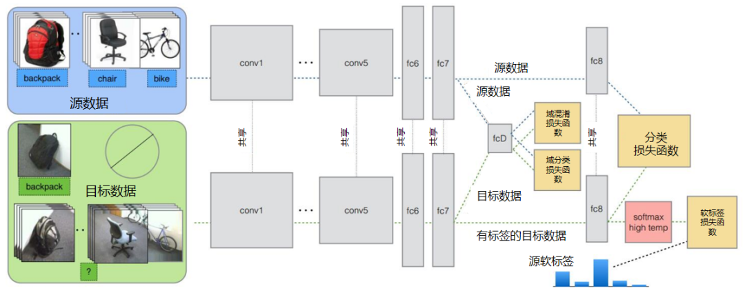 Tzeng 针对目标任务的部分类别有少量标签,剩下的类别无标签的情况,提出名为域迁移和任务迁移的联合 CNN 体系结构(Joint CNN Architecture For Domain and Task Transfer)。其最大的创新之处在于,提出现有的方法都忽略了类别之间的联系,并提出在现有损失函数的基础上还要再加一个软标签损失(Soft Label Loss)函数。