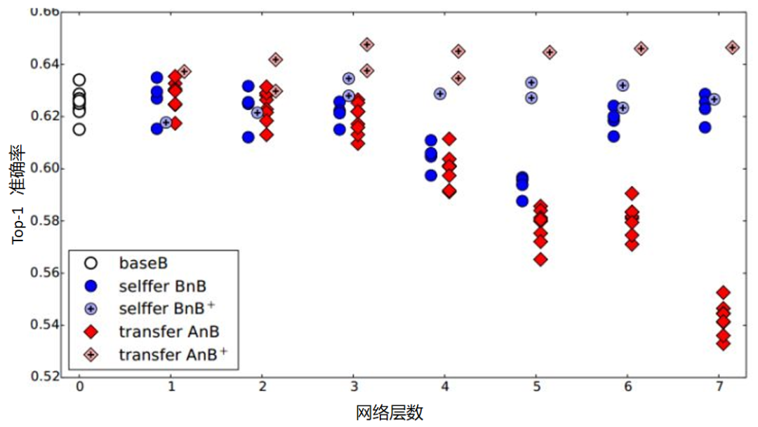 这个图说明了什么呢?我们先看 BnB 和 BnB+(即 BnB 加上微调)。对于 BnB 而言,原训练好的 B 模型的前 3 层可以直接拿来使用,而不会对模型精度有什么损失。到了第 4 层和第 5 层,精度略有下降,不过还可以接受。然而到了第 6 层、第 7 层,精度居然奇迹般地回升了,这是为什么?