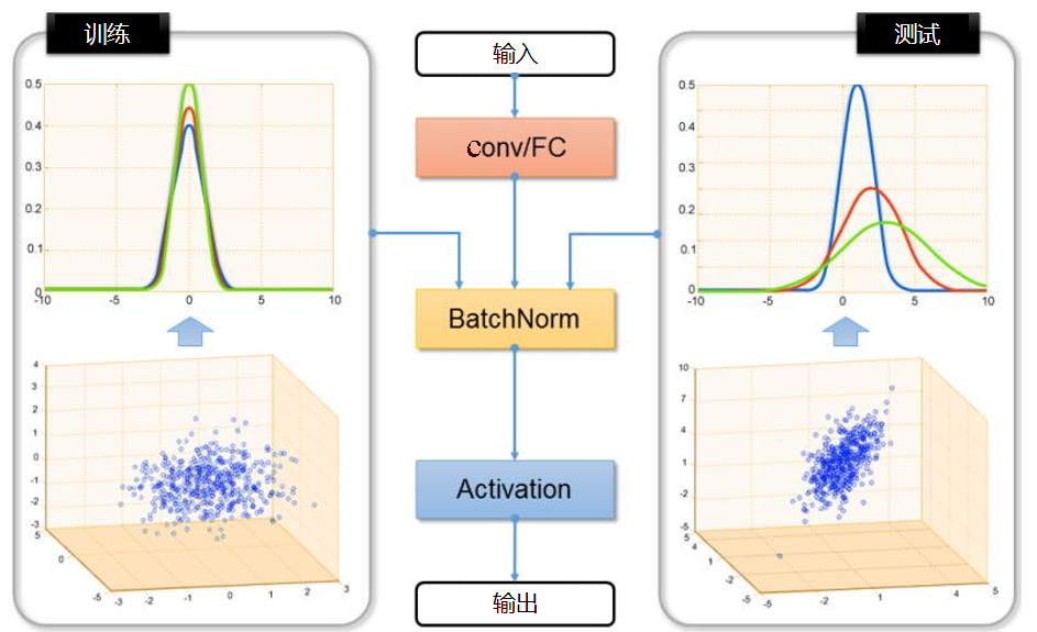 与上述研究选择在已有网络层中增加适配层不同,北京大学的 H Li 和图森科技的 N Wang 等人提出了 AdaBN(Adaptive Batch Normalization)方法 [Li et al.,2018],其通过在归一化层加入统计特征的适配来完成迁移。下图是 AdaBN 方法示意图。