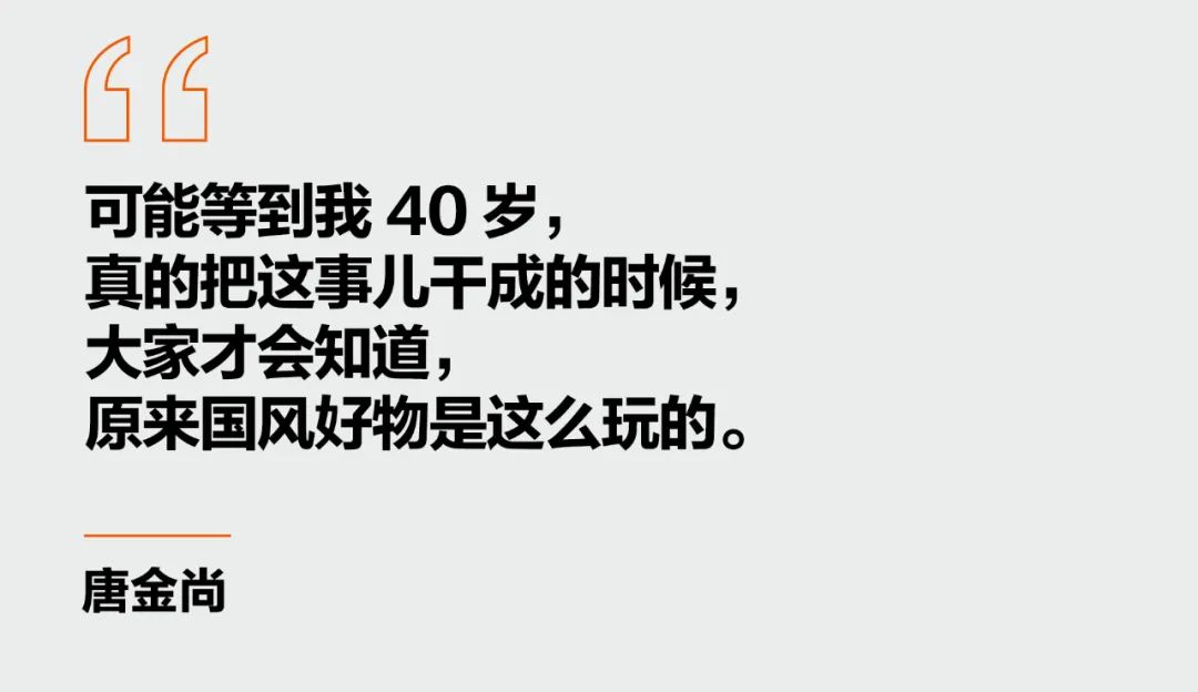 “可能等到我40岁,真的把这事儿干成的时候,大家才会知道,原来国风好物是这么玩的,甚至那时候我们可以做出海。”唐金尚说。