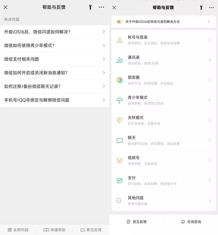 此次更新微信还新增了人工客服功能,据了解,测试版中“设置”页面中的“帮助与反馈”页面 UI 进行了重构,对应的问题前面新增了图标,整体而言更明了,此外还新增了“在线咨询”入口,可以直达“腾讯客服”的公众号。不过目前该公众号中似乎还没有接入人工客服,仍以自动回复机器人为主。