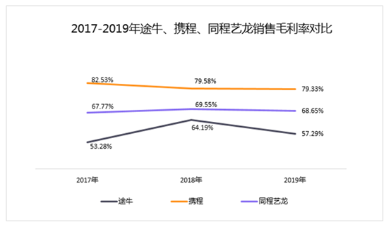 结果反映到财报上,2019年途牛的销售毛利率为57.29%,而携程和同程艺龙的销售毛利率却分别为79.93%和68.65%。