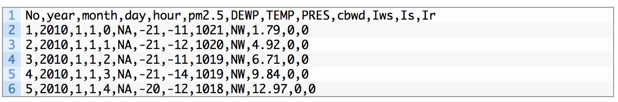 快速检查第一天的 pm2.5 的 NA 值。因此,我们需要删除第一行数据。在数据集中还有几个零散的「NA」值,我们现在可以用 0 值标记它们。