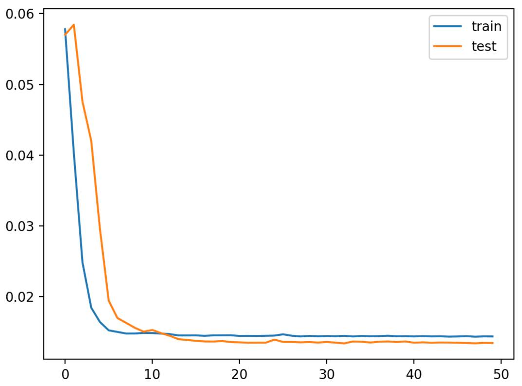 在每个训练 epoch 结束时输出训练和测试的损失。在运行结束后,输出该模型对测试数据集的最终 RMSE。我们可以看到,该模型取得了不错的 RMSE——3.836,这显著低于用持久模型(persistence model)得到的 RMSE(30)。