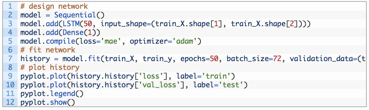 我们将在第一个隐藏层中定义具有 50 个神经元的 LSTM,在输出层中定义 1 个用于预测污染的神经元。输入数据维度将是 1 个具有 8 个特征的时间步长。