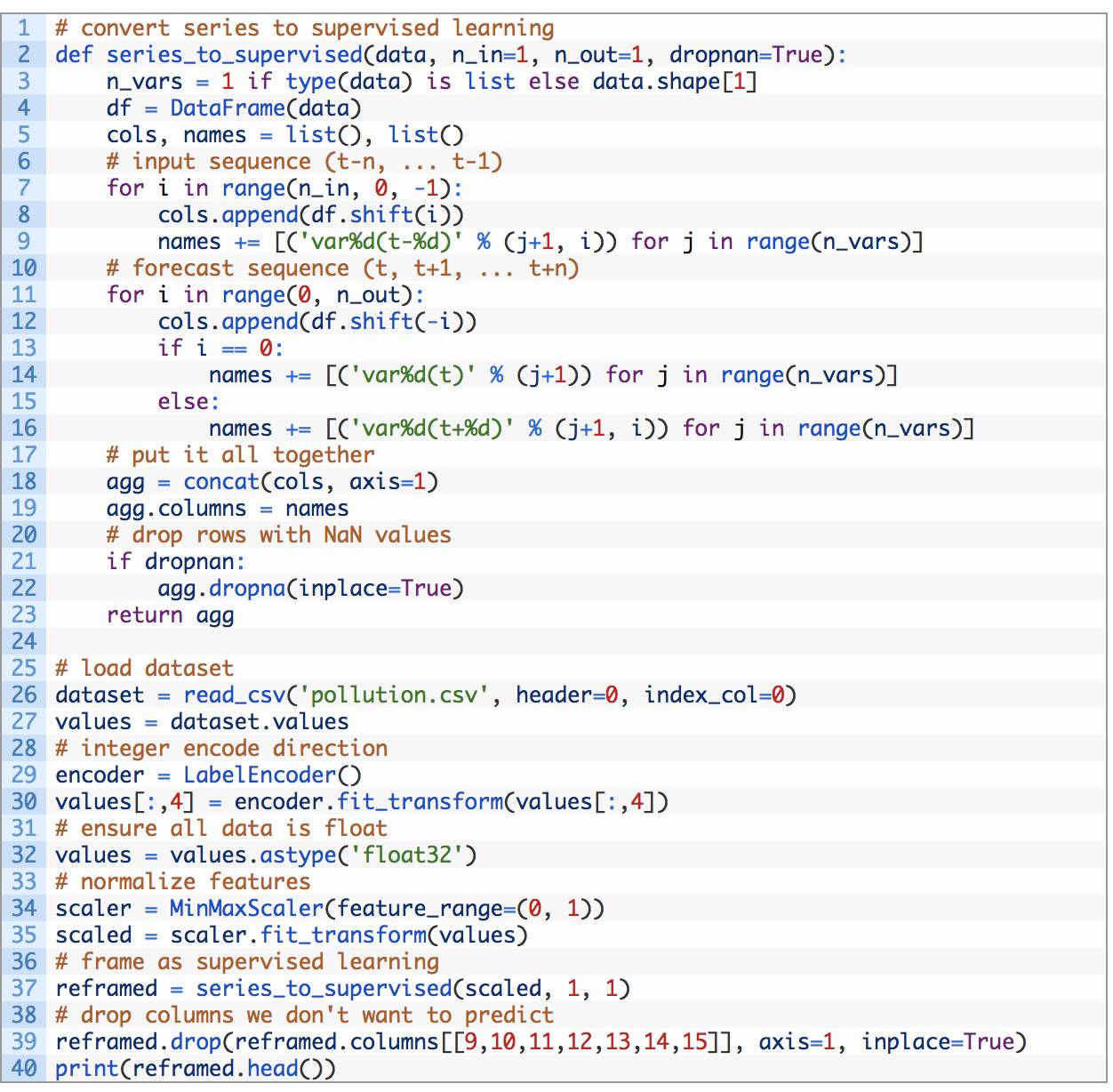我们可以使用之前博客中编写的 series_to_supervised()函数来转换数据集: