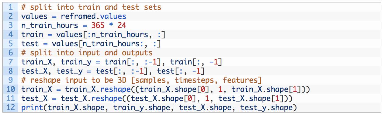 下面的示例将数据集分成训练集和测试集,然后将训练集和测试集分别分成输入和输出变量。最后,将输入(X)重构为 LSTM 预期的 3D 格式,即 [样本,时间步,特征]。