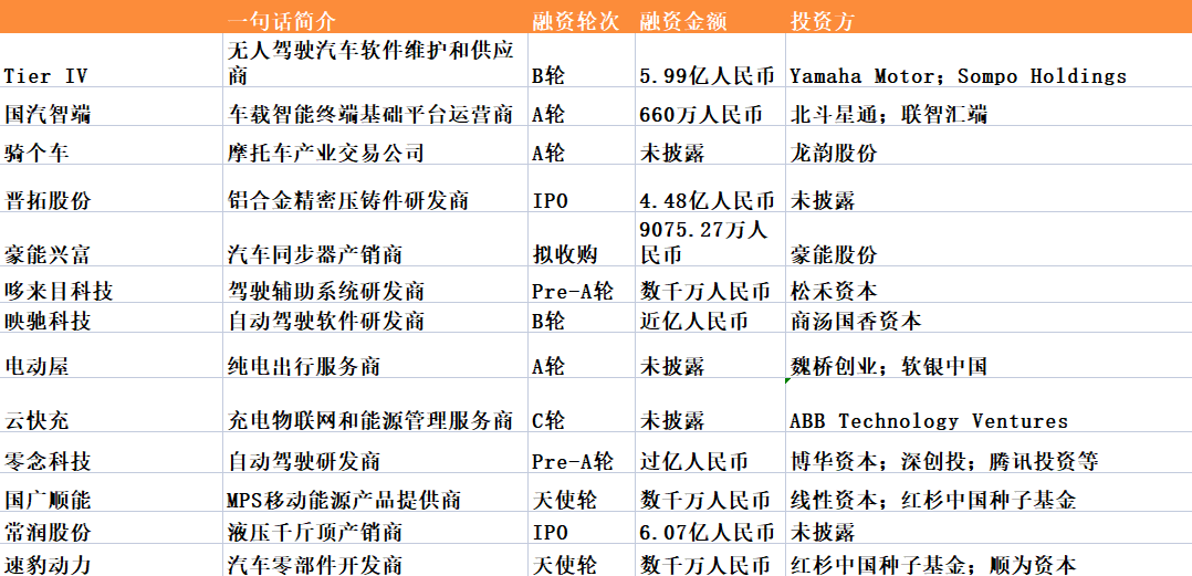 本周全球汽车交通领域融资事件共13起,其中国内12起,国外1起。据睿兽分析不完全统计,本周国内汽车交通融资金额总计或超15亿元人民币,海外融资金额近1亿美元。