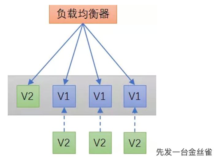 如果金丝测试通过,则把剩余的 V1 版本全部升级为 V2 版本。如果金丝雀测试失败,则直接回退金丝雀,发布失败。