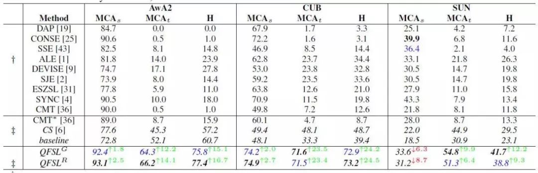 我们在三个数据集上评估了我们的方法。这三个数据集分别为 AwA2,CUB,SUN。在实验中,我们采用属性作为语义空间,用类平均准确度衡量模型效果。