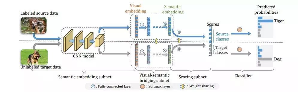 得分函数由单个全连接层来实现。它的权重使用源类和目标类的归一化语义:来初始化。和视觉嵌入子网络和视觉-语义衔接子网络不同的是,得分子网络的权重是固定的,在训练阶段不参与更新。通过这种方式,我们的模型将图像