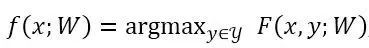 其中 F(∙) 是一个得分函数,其目标是正确的标注比其他不正确的标注具有更高的得分。W 是模型 F(∙) 的参数,F(∙) 通常使用如下的双线性形式: