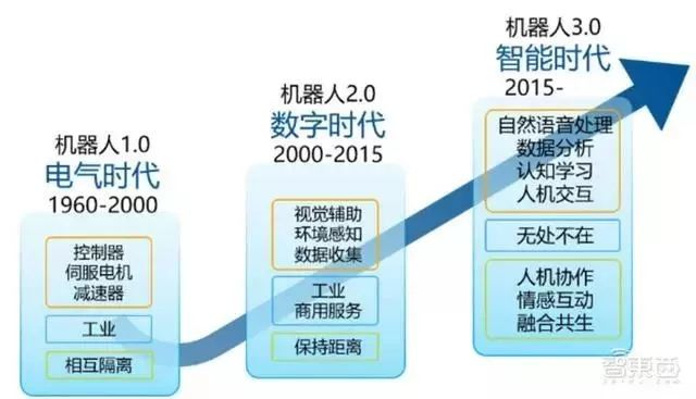 2017年,中国信息通信研究院、 IDC 国际数据集团和英特尔共同发布的《人工智能时代的机器人 3.0 新生态》白皮书把机器人的发展历程划分为三个时代,分别称之为机器人1.0、机器人 2.0、机器人 3.0。