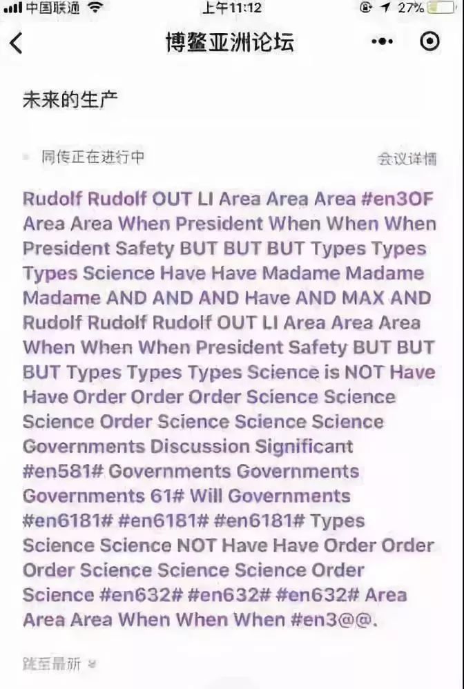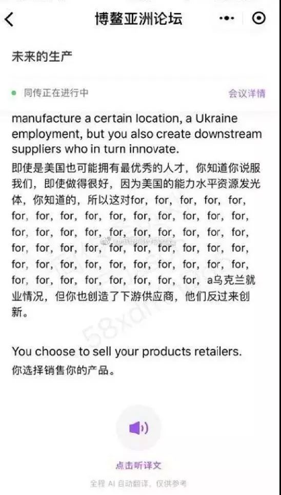 该同传产品在当时主要负责为博鳌论坛的开幕式及部分核心论坛提供同声传译支持,其中包括同传双语内容会议现场投屏、同传内容手机小程序查看、翻译结果语音收听、同传记录回放等。结果会议才开始没多久,网上就爆出同传产品「掉链子」的消息,其中集中出现的问题分别是「大面积单词无意义重复、大小写及字符混乱」和「中英双语切换频率」,比如在一片中文翻译中出现大量无意义的英文单词「for」。