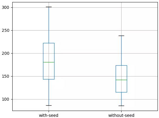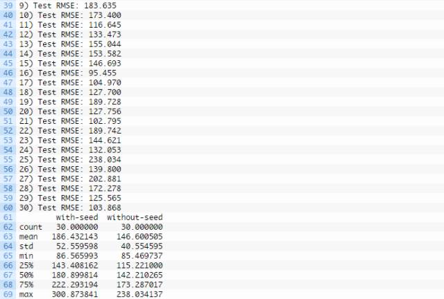 将这种方案预测的平均误差(146.6005050)和另一种方案(初始化状态种子)预测的平均误差(186.432143)做对比即可得出上结论。通过盒须图可以看得更加清楚。