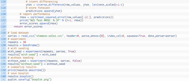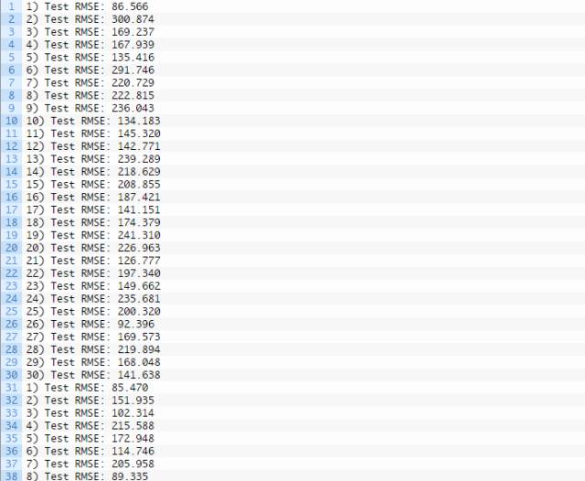 这意味着每个方案将创建并评测30个模型。从每次试验收集的均方根误差(RMSE)给出结果分布,然后可使用描述统计学(如平均偏差和标准偏差)方法进行总结。