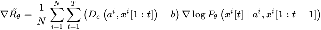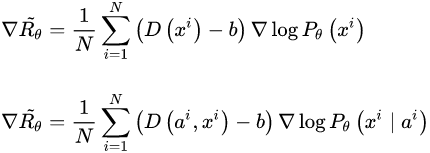 对应地,在 RL + GAN 的文本生成任务中,同样在鉴别器 D 对各个生成样本打出的概率得分上减去奖惩基准值 b,则 4.2 节中 SeqGAN 与 Conditional SeqGAN 期望奖励值的优化梯度计算公式也分别修改为如下: