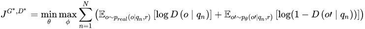 IRGAN 在 Pairwise 情形下的总目标函数如下,其中, o 表示真实的非对称二元组,而 o' 则表示生成式 IR 模型生成的二元组: