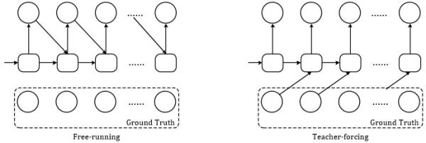 在开始讲解 SeqGAN 中的 Teacher Forcing 之前,先帮助大家简单了结一下 RNN 运行的两种 mode:(1). Free-running mode;(2). Teacher-Forcing mode[22]。前者就是正常的 RNN 运行方式:上一个 state 的输出就做为下一个 state 的输入,这样做时有风险的,因为在 RNN 训练的早期,靠前的 state 中如果出现了极差的结果,那么后面的全部 state 都会受牵连,以至于最终结果非常不好也很难溯源到发生错误的源头,而后者 Teacher-Forcing mode 的做法就是,每次不使用上一个 state 的输出作为下一个 state 的输入,而是直接使用 ground truth 的对应上一项作为下一个 state 的输入。