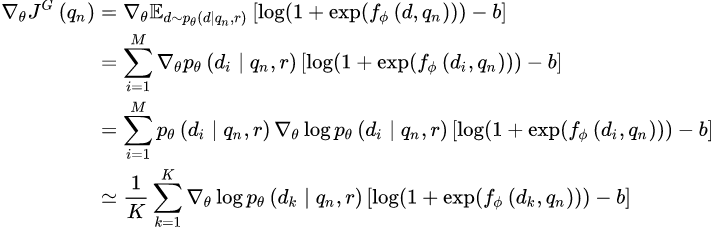 相对地,生成器 G 就直接输出以 query 为 condition 答案池中所有 document 与该 query 的关联分布,不幸地,我们必须将通过这个关联分布,过滤出当前认为最相关的 document 答案,才能作为鉴别器 D 的输入来判定此时此刻检索结果的质量,原本连续型的分布经过这一步的折腾又变成离散型的数据了,还好, 我们有强化学习,设 ,则生成器 G 的目标函数被写成:
