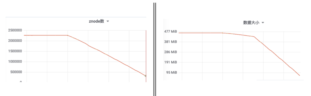 有时用户正在使用的 Topic 不多,但 zk-node 数量却很大,Pulsar 对 zk-node 的放大倍数较高。上图拐点是 zk-node 脏数据清理的时点,可以看到 zk-node 数据泄漏的情况非常严重,达到 5 倍之多。
