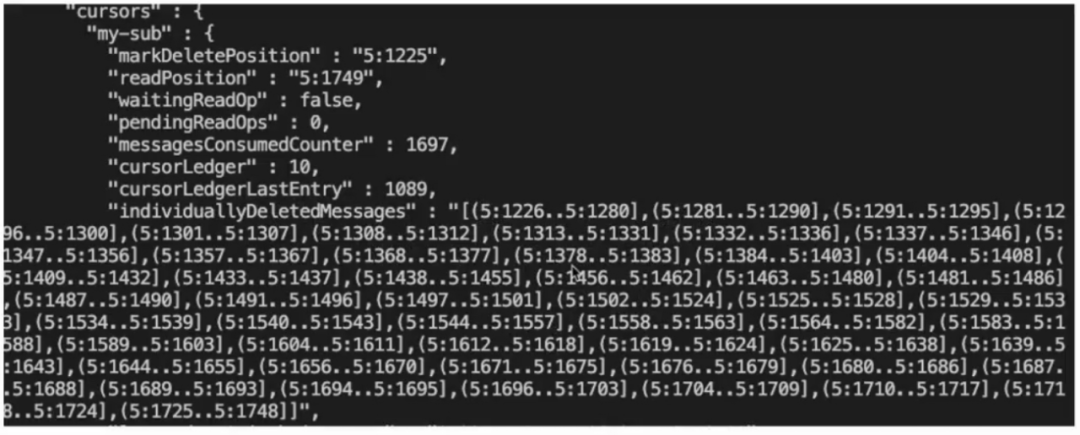 该记录中第一个 Ledger id 是 5:1280,该集合是闭区间,说明消息已经被 Ack;之后的 5:1281 是开区间,说明消息没有被 Ack。这里就用开闭区间的形式来区分消息是否被 Ack。