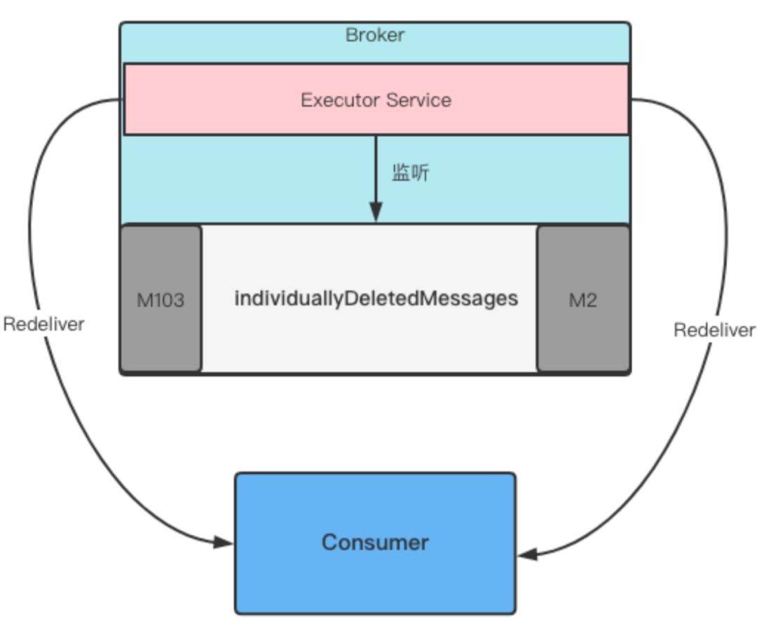 另一种方法是 Broker 的主动补偿策略。因为 individuallyDeletedMessage 存储在每一个 ManagedCursor,也就是每一个订阅对象到 Broker 实际类中的映射。每一个订阅都可以拿到对应的 individuallyDeletedMessage 集合,Broker 就可以主动把集合推送到客户端,也就是主动补偿。