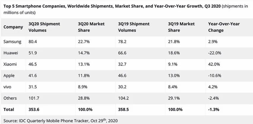 IDC数据显示,苹果第三季度全球出货量同比下滑10.6%,市场份额跌至11.8%。华为出货量则跌去了22%。