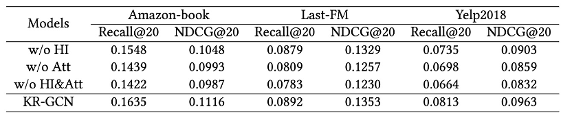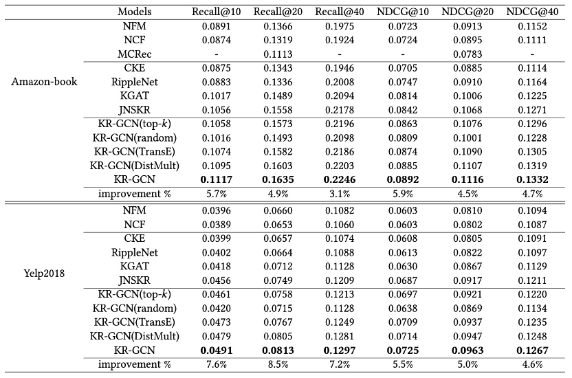 本文在Amazon-book,Yelp2018和Last-FM三个数据集上进行实验,KR-GCN 在三个数据集上的性能都优于基线模型,性能比较结果验证了 KR-GCN 的有效性。