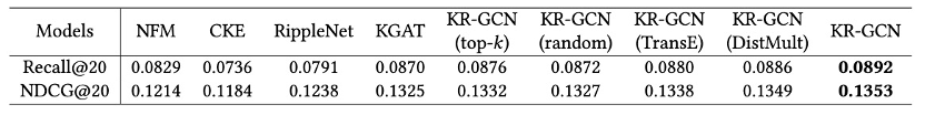 与基线模型中的最佳性能结果(即Amazon-book中的JNSKR、Yelp2018和Last-FM 中的 KGAT)相比,KR-GCN的Recall@20分别提高了 4.9%,8.5% 和 2.5%,NDCG@20分别提高了4.4%,5.0% 和 2.1%。我们将所提KR-GCN 优越的推荐性能归因于利用图结构信息和语义信息,并选择了更有助于预测用户偏好的推理路径。