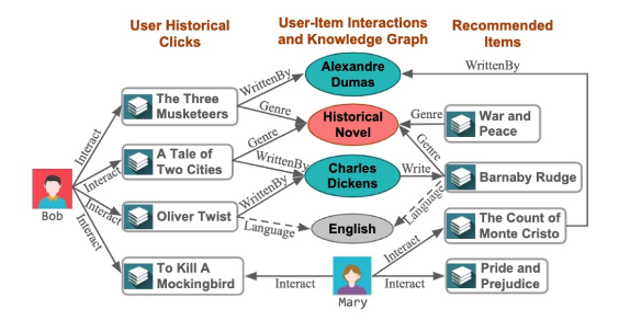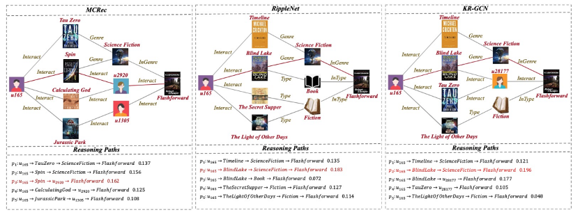 我们从Amazon-book中选择了一个示例来展示KR-GCN的可解释性,可以发现,与对比模型相比,KR-GCN 在用户和物品之间提供了更多类型的关系。