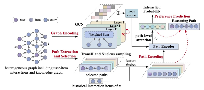 KR-GCN包括四个模块:图编码模块、路径抽取与选择模块、路径编码模块和偏好预测模块。图编码模块旨在学习异构图中的节点表示,路径抽取与选择模块旨在从异构图中抽取出用户和物品之间的路径并从中选择出高质量的推理路径,路径编码模块用于学习推理路径的表示,偏好预测模块则根据推理路径来预测用户的偏好。