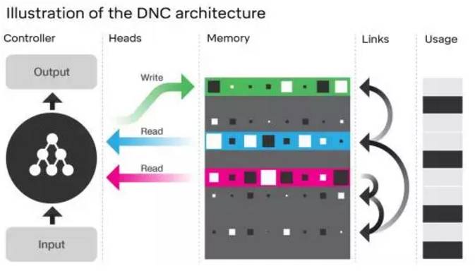 当研究者设计 DNC 时,他们想要机器能够学习自己构建和引导复杂的数据结构。DNC 的核心是一个被称为控制器(controller)的神经网络,其类似于计算机中的处理器。控制器的作用是获取输入、读取和写入记忆、以及生成可以被解读为答案的输出。而其记忆(memory)则是一个位置(location)的集合,其中每个位置都存储了一个信息向量。