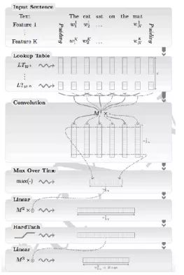 实际上基于窗口的方法已经可以解决很多常见的任务,但是如果一个单词如果非常依赖上下文的单词,且当时这个单词并不在窗口中,这时就需要sentence approach,这里所使用的卷积操作与卷积神经网络中的卷积操作基本相同。这里需要对句子中的每一个单词进行一次卷积操作,这里池化过程选择最大池化,这里认为句子中大部分的词语对该单词的意义不会有影响。