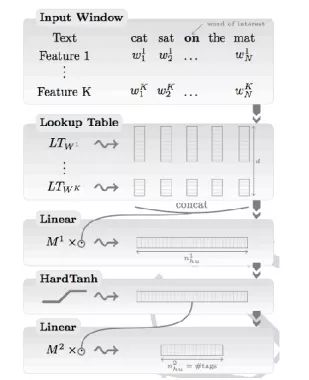 首先我们来介绍第一篇论文《Natural Language Processing (almost) from Scratch》,该论文主要是针对原来那种man-made 的输入特征和人工特征,利用神经网络的方法自动抽取出文本句子更高级的特征用来处理自然语言处理里的各项任务,例如本文中输入是一个句子序列,输出是对句子中各个词的词性的预测。该文提出了两种方法,一种是滑动窗口的方法(window approach),另一种就是将整个句子作为输入(sentence approach)的方法,两种方法就分别对应着局部和全局的特征。模型结构如下图所示: