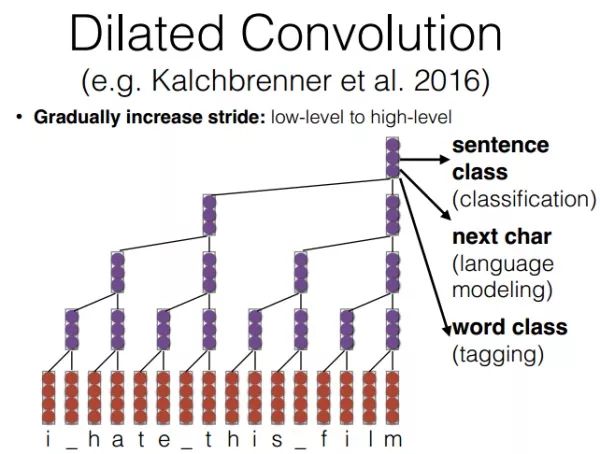 刚才这篇论文是对池化过程进行改进,接下来的两篇论文是对卷积层进行了改进。第三篇论文是《Neural Machine Translation in Linear Time》,该论文提出了扩张卷积神经网络(Dilated Convolution)应用于机器翻译领域。Dilated convolution实际上要解决的问题是池化层的池化会损失很多信息(无论该信息是有用还是无用)。Dilated convolution的主要贡献就是,如何在去掉池化操作的同时,而不降低网络的感受野。下图理解起来更加容易,卷积的输入像素的间距由1-2-4-8,虽然没有池化层,但是随着层数越深覆盖的原始输入信息依旧在增加。也就是我们通常卷积核与输入的一个区域的维度大小保持一致,但是去掉池化层后,我们随着深度增加,卷积核的所能覆盖的输入区域扩展一倍。