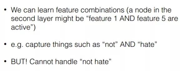 在语言模型里n-gram模型是可以用来解决,想法其实就是将连续的两个词作为一个整体纳入到模型中,这样确实能够解决我们刚才提出的问题,加入bi-gram,tri-gram可以让我们捕捉到例如“don’t love”,“not the best”。但是问题又来了,如果我们使用多元模型,实际训练时的参数是一个非常大的问题,因为假设你有20000个词,加入bi-gram实际上你就要有400000000个词,这样参数训练显然是爆炸的。另外一点,相似的词语在这样的模型中不能共享例如参数权重等,这样就会导致相似词无法获得交互信息。