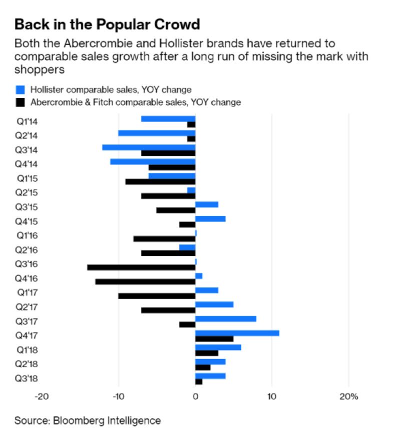 经过了错失消费者的漫长周期,爱芙趣和Hollister品牌都恢复了可比销售额增长
