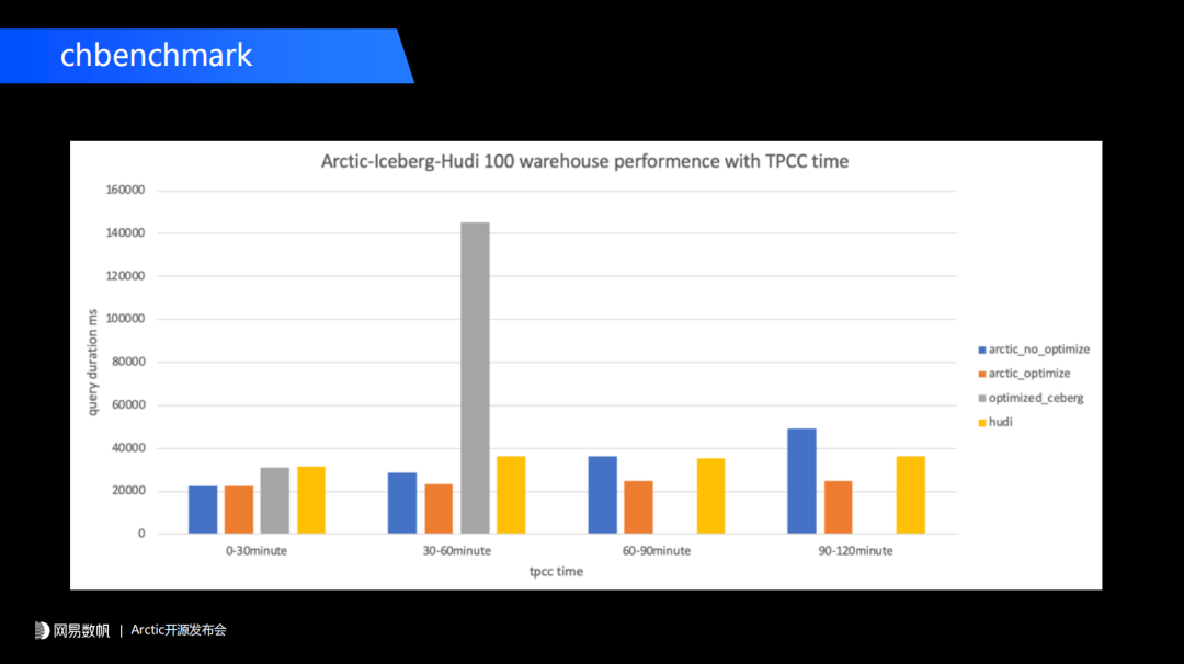 团队还对比了 Hudi,结果显示,Arctic 和 Hudi 一样,通过后台能够保证数据分析的性能,维持在一个比较平稳的数字。