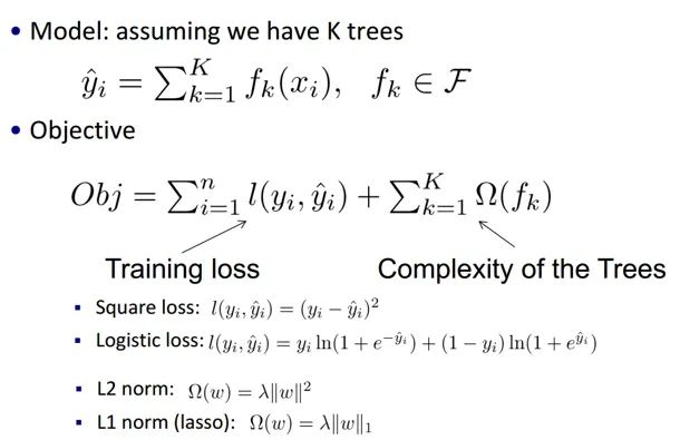 好的模型需要具备两个基本要素:一是要有好的精度(即好的拟合程度),二是模型要尽可能的简单(复杂的模型容易出现过拟合,并且更加不稳定)因此,我们构建的目标函数右边第一项是模型的误差项,第二项是正则化项(也就是模型复杂度的惩罚项)