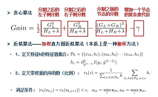 一种办法是贪心算法,遍历一个节点内的所有特征,按照公式计算出按照每一个特征分割的信息增益,找到信息增益最大的点进行树的分割。增加的新叶子惩罚项对应了树的剪枝,当gain小于某个阈值的时候,我们可以剪掉这个分割。但是这种办法不适用于数据量大的时候,因此,我们需要运用近似算法。