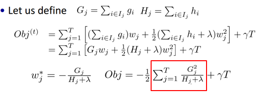 那么树的复杂度式子:右边第一项是叶子结点的数量T,第二项是树的叶子结点权重w的l2正则化,正则化是为了防止叶子结点过多