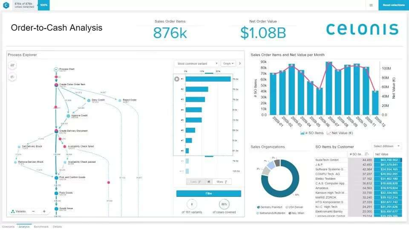 流程挖掘在海外并不是新玩意儿。2011 年,海外就出现了流程挖掘公司 Celonis ,市场份额第一,估值高达 110 亿美元。2020 年 10 月 Celonis 收购了欧洲知名的 RPA 厂商 Integromat 。