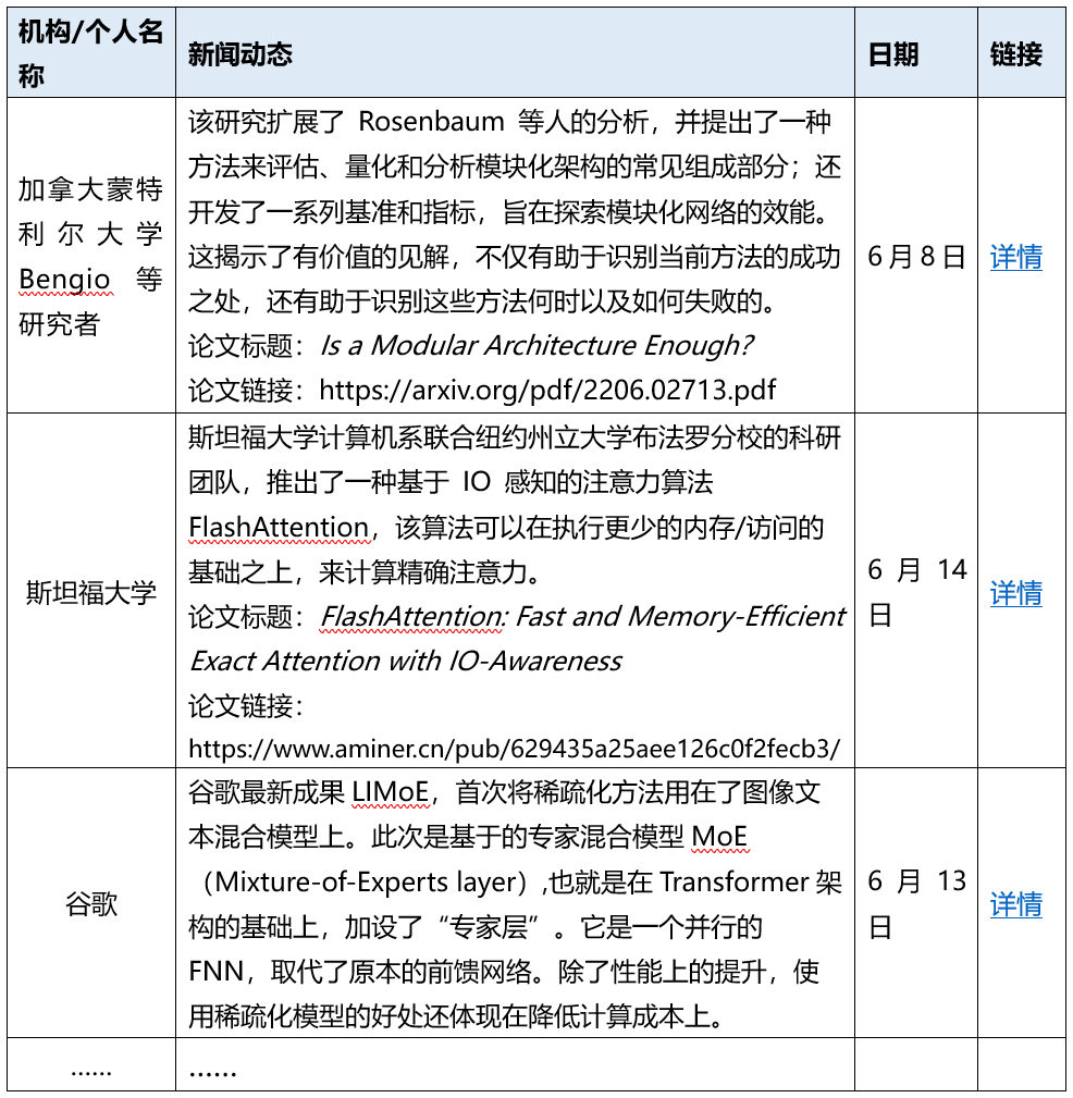 6 月正值高考季,人工智能业界共计发生 190 个事件,虽比上月略少,但新闻量较上月增加 14.2%,达 579 篇,事件热度总体趋势如下图所示。本月,热度最高的是 18 位华人入选加拿大工程院院士,其次是阿里巴巴达摩院发布 FEDformer 模型。此外,高校 AI 专业情况及相关成果引发了较多关注,尤其,南京大学首届AI专业学生毕业且平均年薪超 30 万;清华姚班三位学霸获 STOC 2022 顶会最佳学生论文奖、同济学子获 CVPR 最佳学生论文奖等,反映出我国在 AI 高层次人才培养方面的成果。