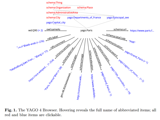在YAGO 4中,作者采用schema.org简单且清晰的分类体系来取代Wikidata复杂且费解的分类体系。因此,YAGO 4是一个逻辑一致的知识库,可以进行基于OWL的推理。