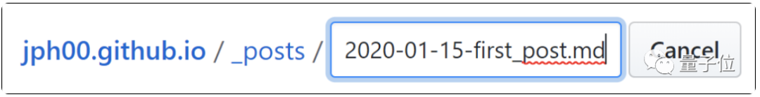 所有的文章都会放在_posts文件夹中。单击它,然后单击创建文件按钮,创建一个新的文件。文件名命名的格式是:year-month-day-name.md,其中year是四位数,而month和day是两位数。“name”可以自定义,扩展名md则用于Markdown。
