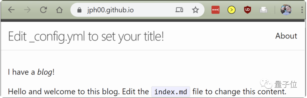 博客的域名就是,**github上注册的名字+github.io,页面就会显示刚才输入的内容。