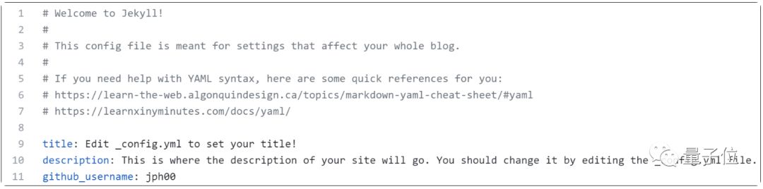 还可以对博客进行其它设置,单击名为_config.yml 的文件,然后像之前一样单击编辑按钮,在冒号后面输入相应的内容,可以更改标题,描述和GitHub用户名值。输入的内容就会在主页显示。